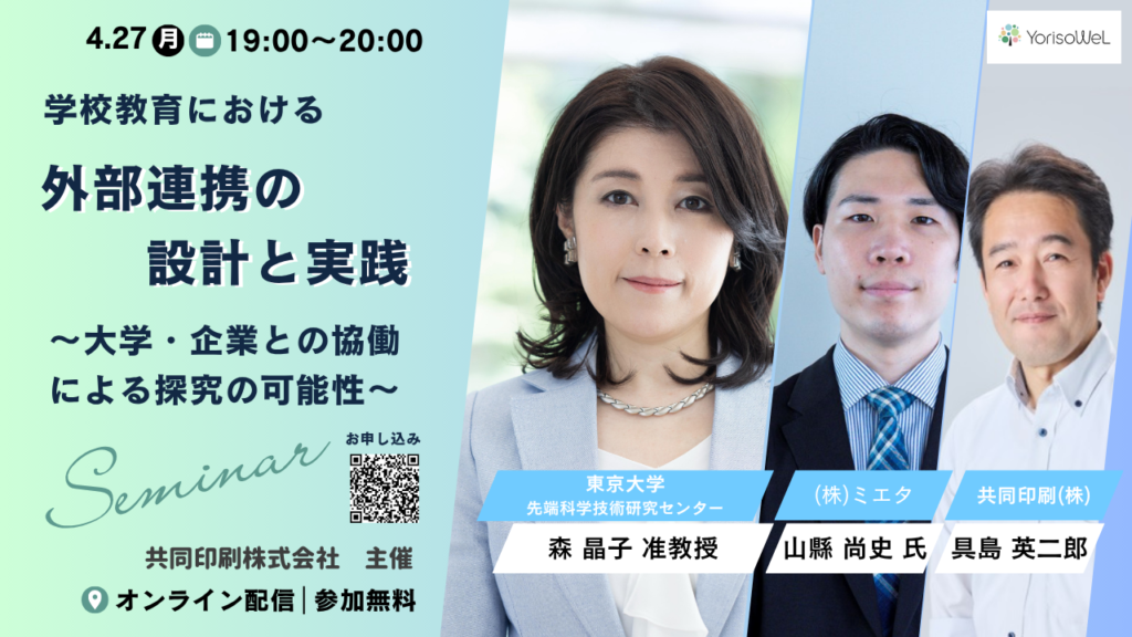 この度、2026年3月の開催に引き続き、共同印刷株式会社様の主催による高校の先生方を対象とした無料ウェビナーに、先端教育共創分野/先端教育アウトリーチラボ(AEO)の森が登壇します。